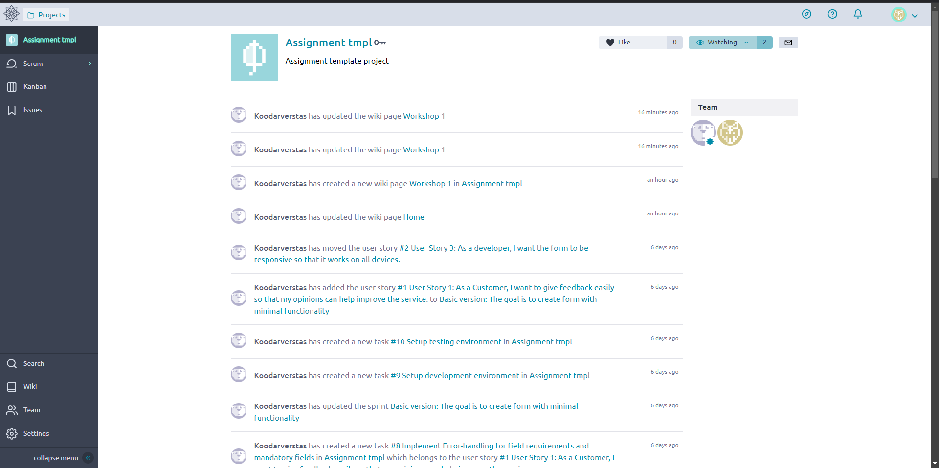 When clicking on a project you will find a page that looks like this. Here you can see the team assigned to the project, action history, scrum and kanban, project wiki and current Issues.