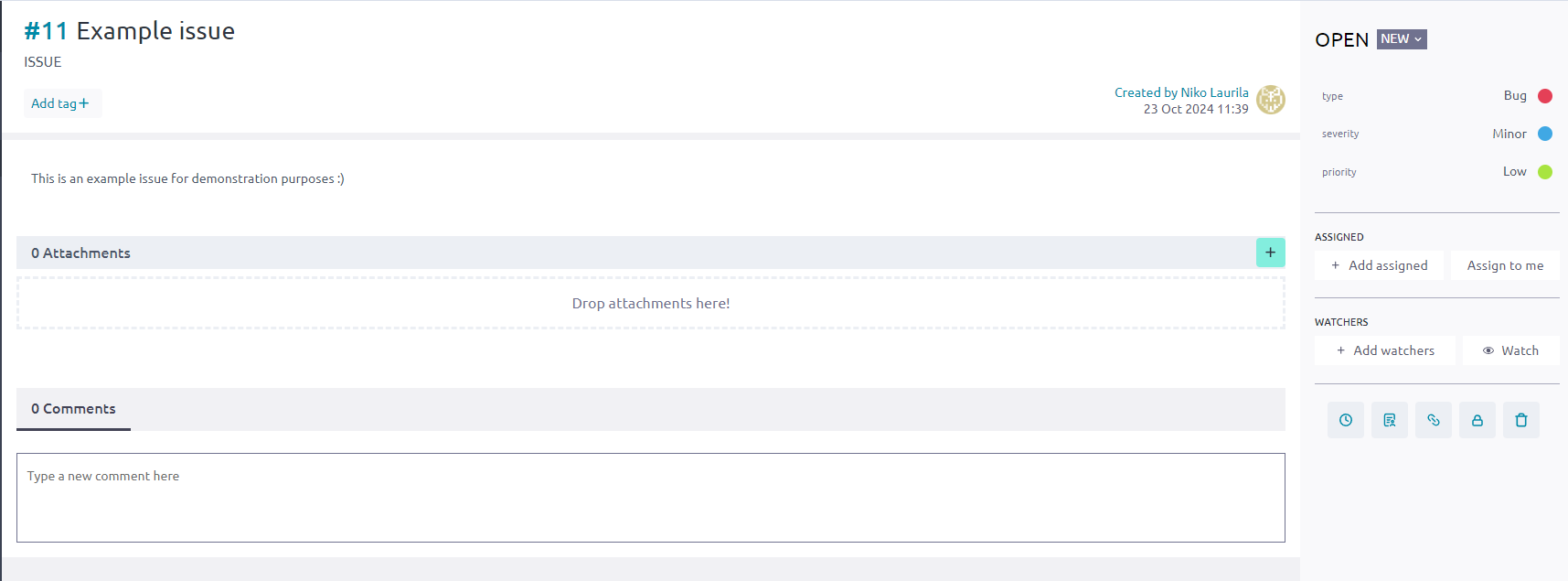 This is the detailed issue page. Here you can see the description of the issue including the status, assigned personnel, possible attachments and comments made by other people in the project.