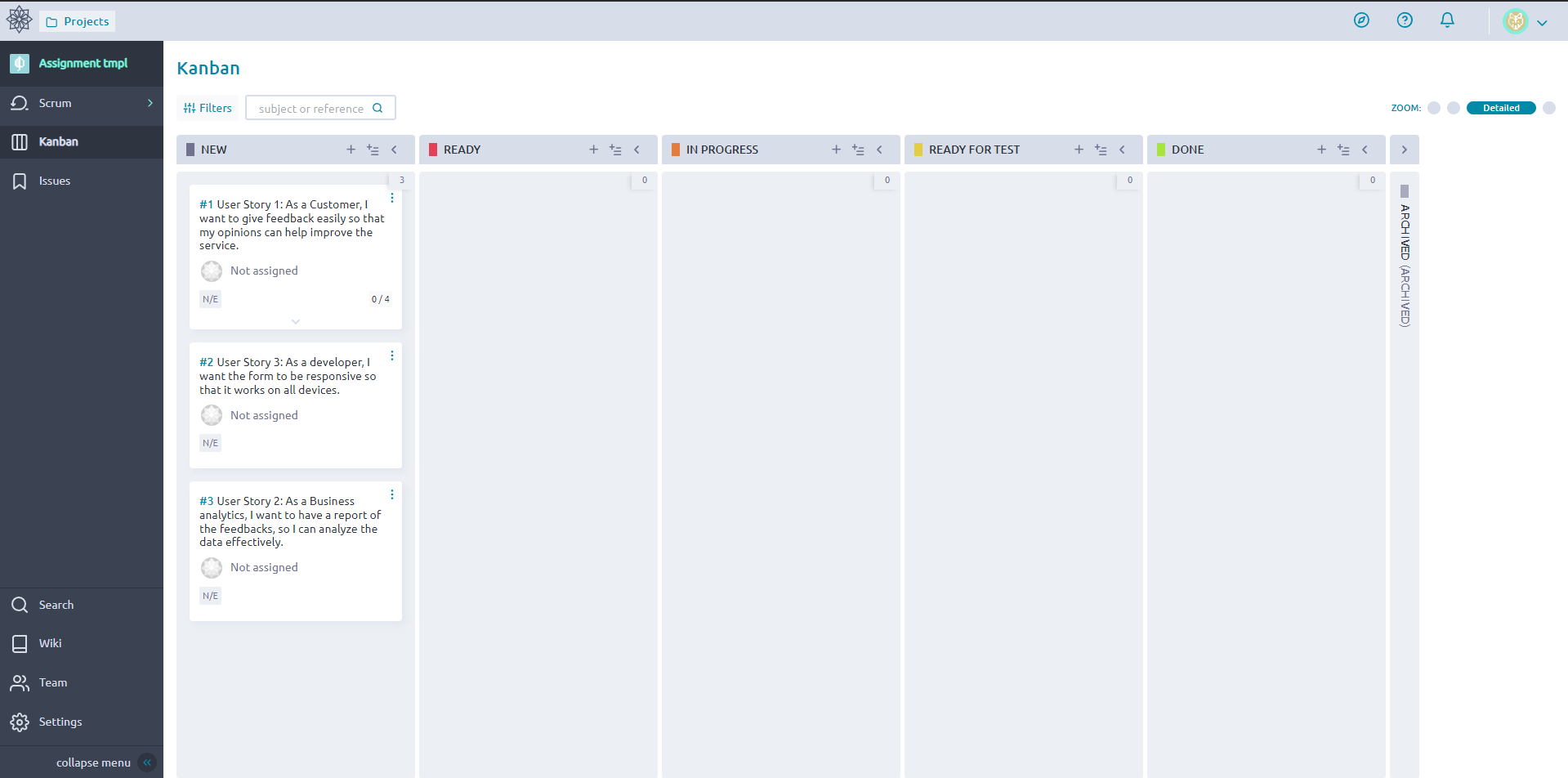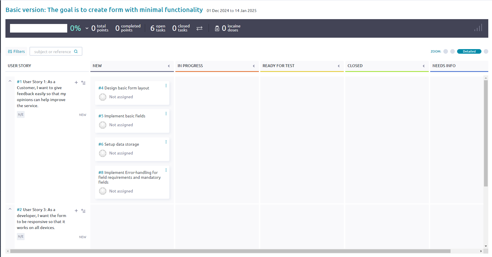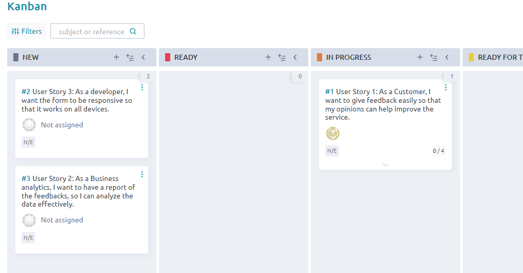 Here for example, I have “started working” on a task in user story 1. I have been assigned to the development to tasks for story 1. To reflect this change I have updated the kanban view to reflect the current state of the entire story.